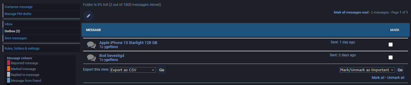 Voor een of andere reden blijft de private message hangen in de Outbox. Is je inbox vol?