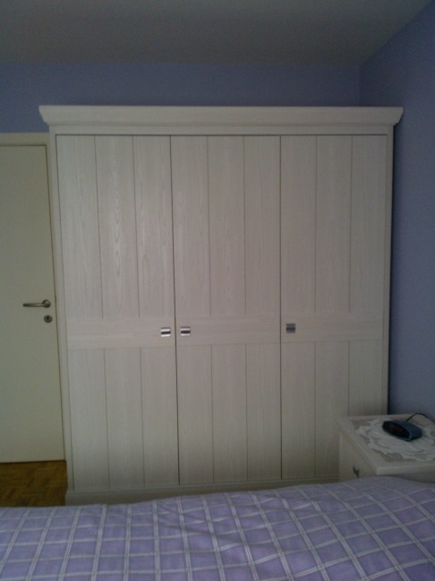Kleerkast 3 deuren, 2 nachtkastjes, commode 4 laden, bed met dubbele lattenbodem (160 x 200), matras Allegro Clima.