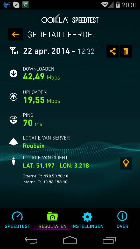 Hier in brugge nog eens getest maar dan buiten op het stationsplein. Krijg niet hoger ook de ping lijkt wat hoog ivm de eerste speedtests hier.