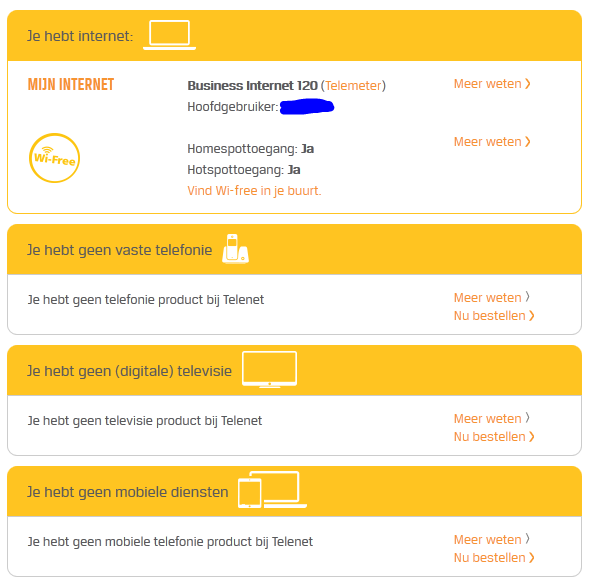 Ik heb geen ENKEL ander telenet product, toen ik naar het 0800 nr belde op die pagina van business internet, vertelde die sales mij doodleuk dat het sinds vorige week Business Internet 160 noemt en dat het voor de prijs is van Business Internet 120.