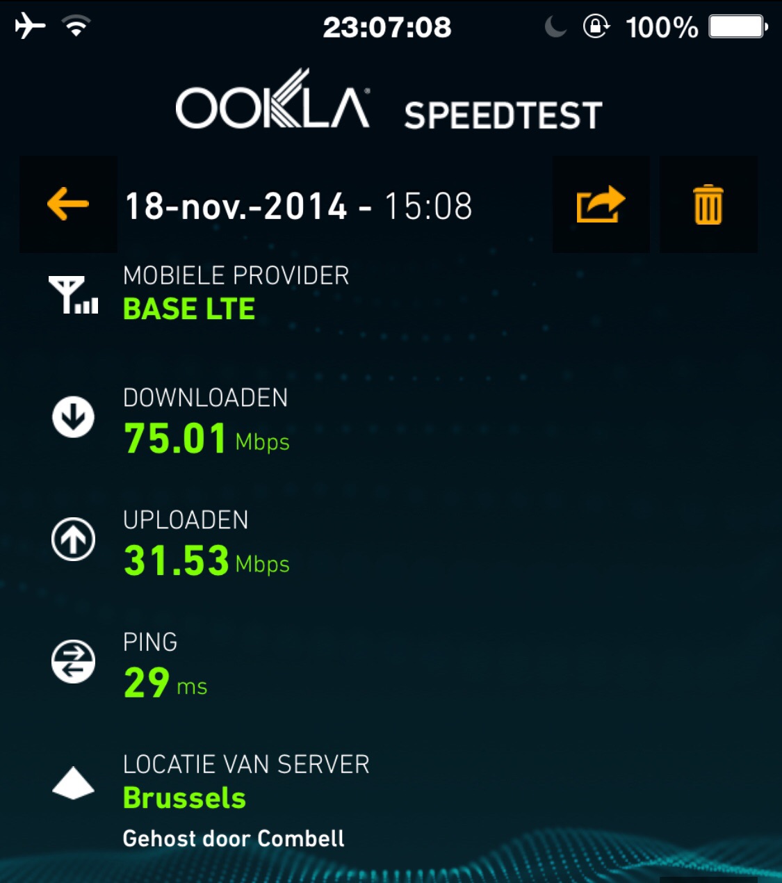 Nooit eerder haalde ik betere resultaten bij Base dan deze. De rest lag tussen 76Mbit en deze, met de laagste ping op 26ms (meermaals).
