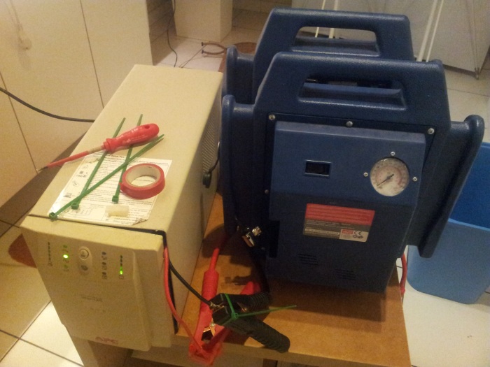 Kriebels ? Die jumpstart moet veel meer ampere leveren over die klemmen bij het starten van een auto, dat de load in vergelijking voor een UPS een joke is. Plus klem volledig afgetaped zodat ie nooit met de - kan kortsluiten. Ik zie op zich geen issue met deze opstelling. Verder is het laagspanning dus geen CE zever ;)