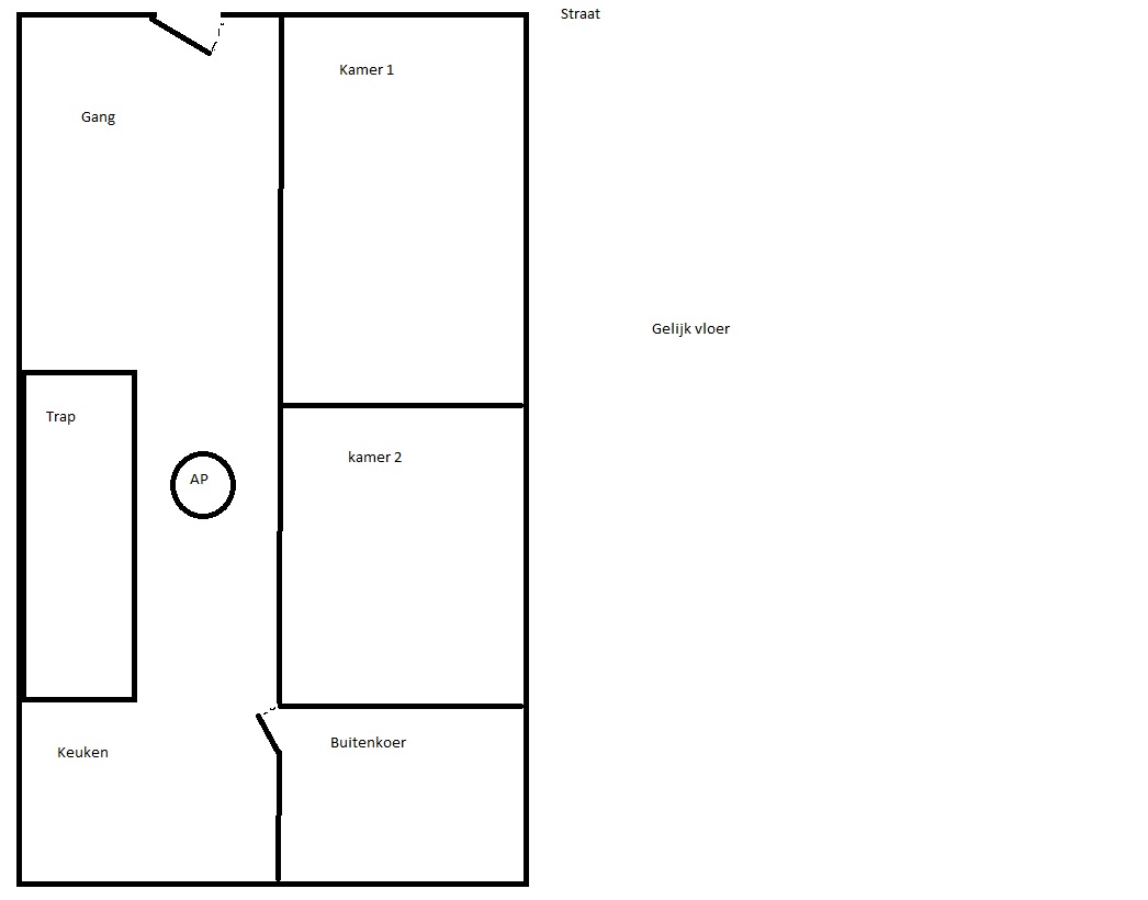 Mijn idee is om een AP neer te zetten in de gang op de gelijksvloers. Deze moet dan gelijksvloer en eerste verdiep coveren. Dan ga ik over naar het derde verdiep en plaats ik terug een AP en deze covert bovenste verdiep en tweede verdiep. Of ik zou deze op tweede verdiep plaatsen en deze dan derde verdiep bedienen.
