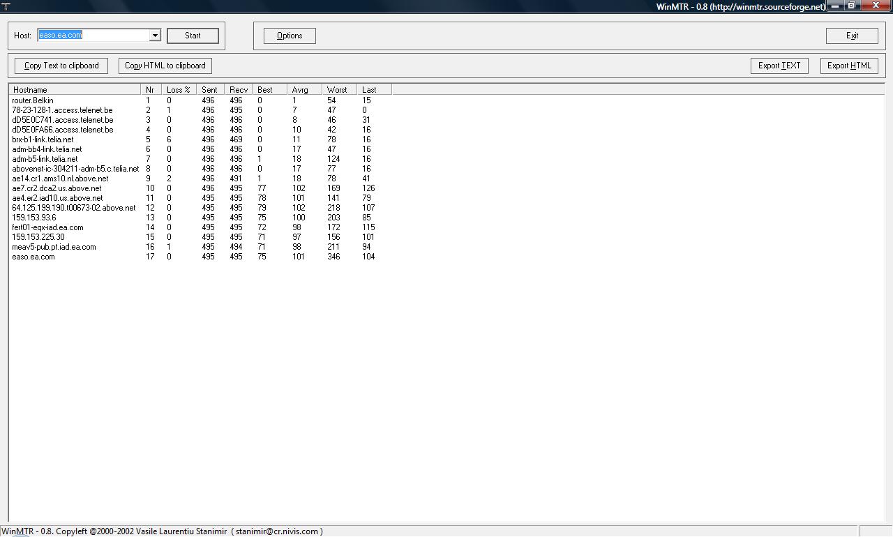 Goztow schreef:Laat winmtr eens lopen op één van de game server's ip gedurende 10 minuten en post je resultaten.