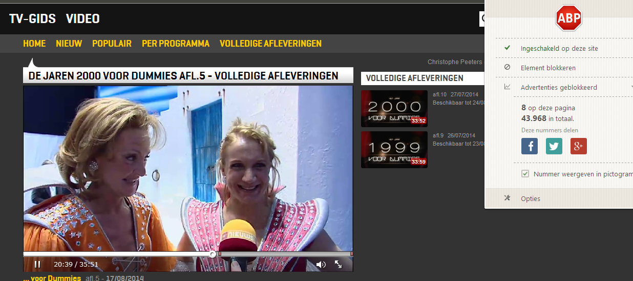meon schreef:Raar. Ik heb Ghostery en Adblock Plus ingeschakeld staan en de volledige afleveringen bekijken gaat goed.
