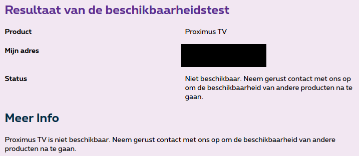 Die tekst in de figuur krijg je te zien indien Proximus TV niet mogelijk is op het opgegeven adres.Vaganzza schreef:Waar vind je deze test op de site? Zelfs via Google vind ik deze niet (enkel die voor proximus tv ...)