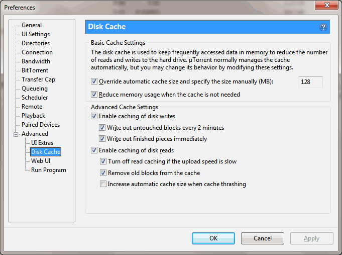 Bij uTorrent merkte ik vorig jaar dat bij hogere snelheden de disk caching soms problemen gaf (="disk thrashing", wat in de uTorrent statusbalk onderaan wordt aangegeven door 'disk overload' of zo) en de download telkens volledig stil viel voor een minuutje. Een aanpassing van de cache grootte (ik stelde 128MB in) verhielp het probleem -- uTorrent preferences>Advanced>Disk Cache>