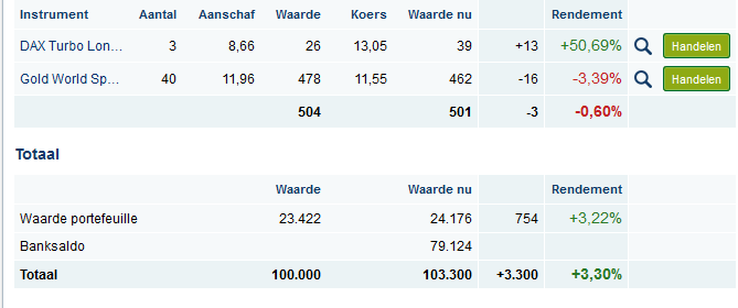 Klopt. Ook vind ik 100.000 euro om mee te spelen wel vrij veel; in het echte leven zijn er toch niet veel mensen die dat bedrag gaan beleggen lijkt me.didi79 schreef:Probleem in deze competitie is dat ze niet lang genoeg duurt om op langetermijnwinst te rekenen. Je wordt dus eigenlijk een beetje verplicht om op korte termijn te speculeren. Dus in de competitie moet je (als je voor de ranking speelt tenminste) toch een andere strategie hanteren dan als je in het echt zou beleggen.