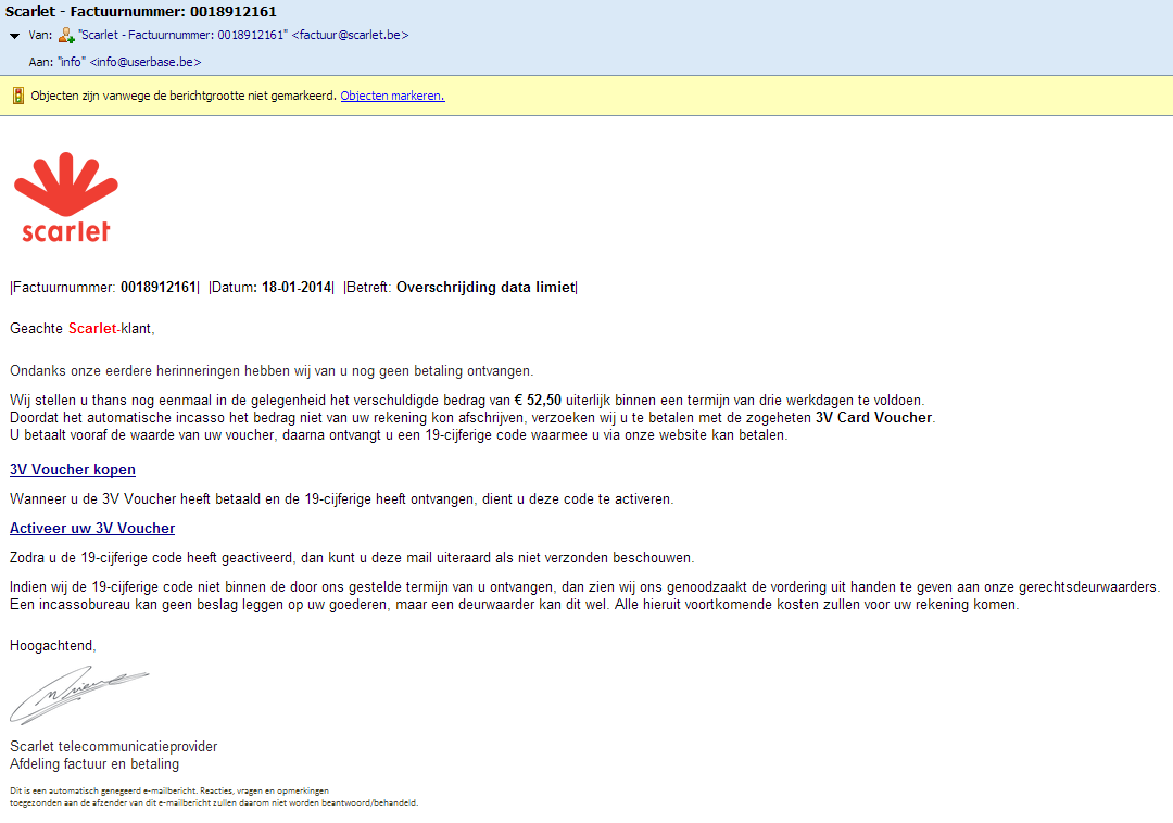Ik ben nooit klant geweest bij Scarlet en heb ook geen opties om het te worden. Bangelijk is het om weten dat er toch weeral mensen in dit soort van mails gaan geloven, want het ziet er allemaal heel echt uit inclusief logo, etc...