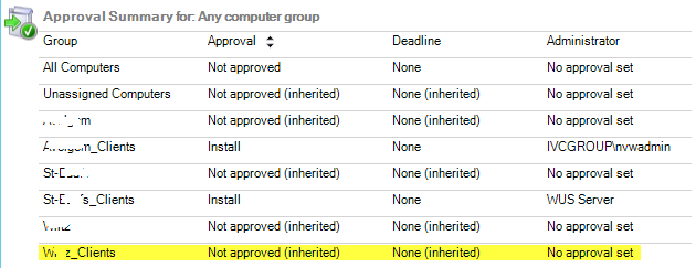 Dus op alle clients worden deze geapproved, uitgezonderd die in het geel. Dit terwijl in printscreen 1 duidelijk te zien is dat de updates geapproved worden voor alle 3 de Client groepen.
