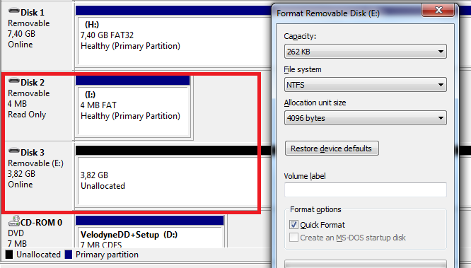 dan is er nog disk 3 van net geen 4 GB ( 4 GB min 4 MByte) , maar als we die proberen formatteren, dan toont hij enkele honderden kilobytes: