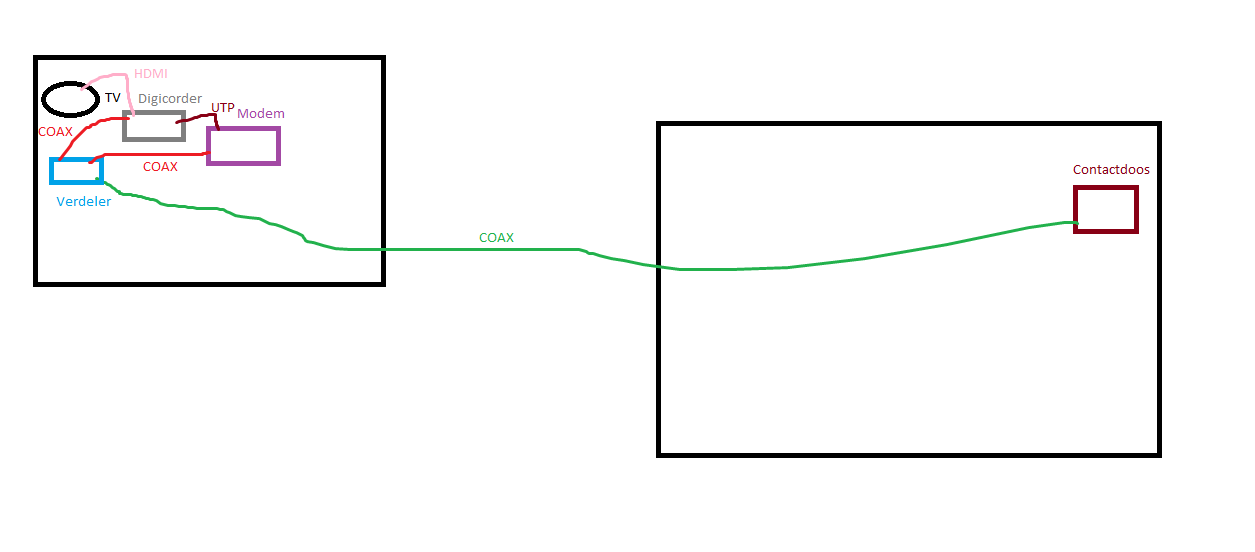 Ik ben pas ingetrokken in een huurappartement en daar is de wandcontactdoos van de tv in de aanpalende eetkamer naast de living. Er ligt nu dus al een coaxkabel van die contactdoos naar de living, daar stond bij de vorige huurder ook de tv. Ook hangt er bij die contactdoos nog een modem.