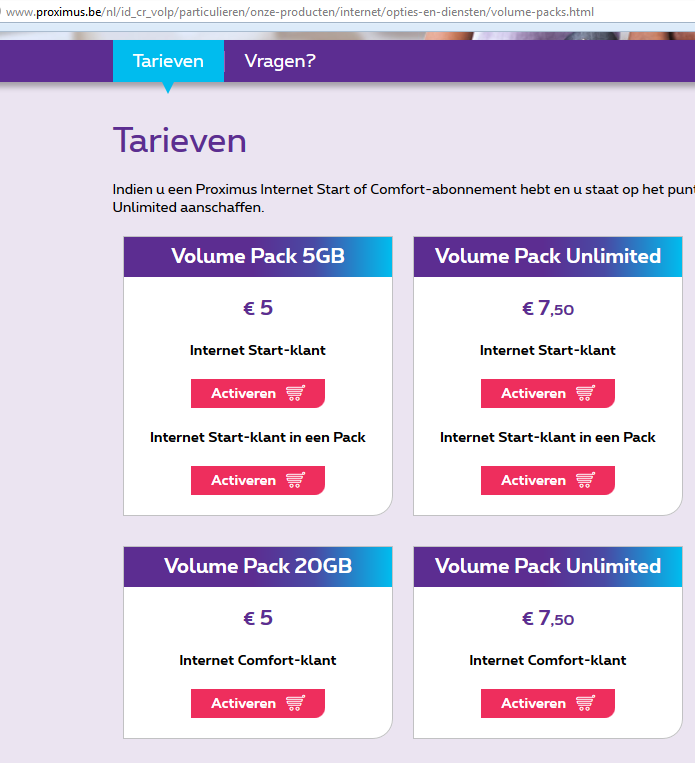 Als ik nu op de website kijk, kom ik alleen volumepacks tegen van 5 en 20 GB (voor 5 euro afhankelijk van Start of Comfort) en geen unlimited volume (voor 7,5 euro).