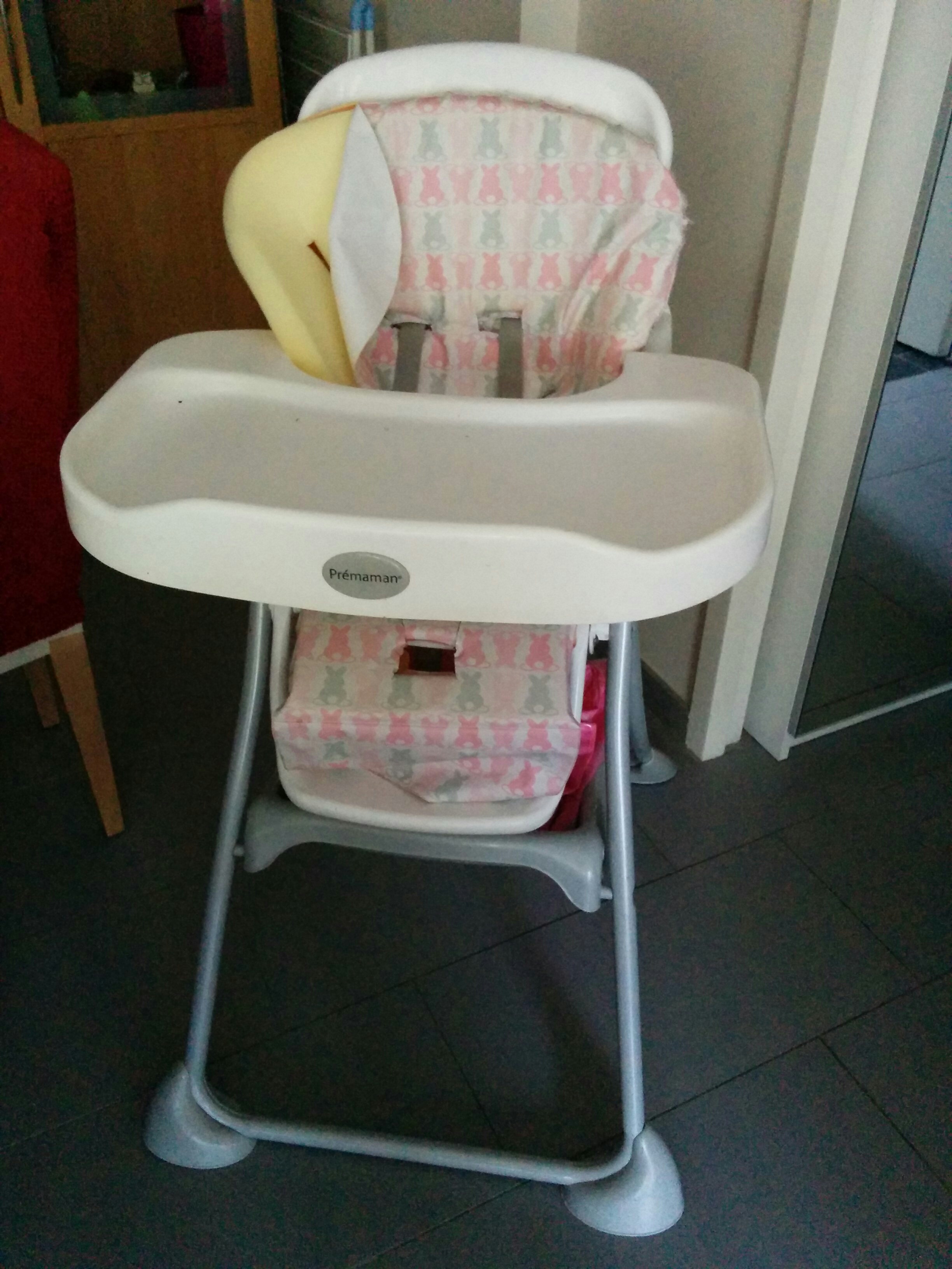 Babystoel, om in te eten, bij ons gebruikt tot 2 jaar en 3 maanden. Niet verstelbaar. Met riempjes om baby vast te gespen, baby zit er eigenlijk heel stevig in vast