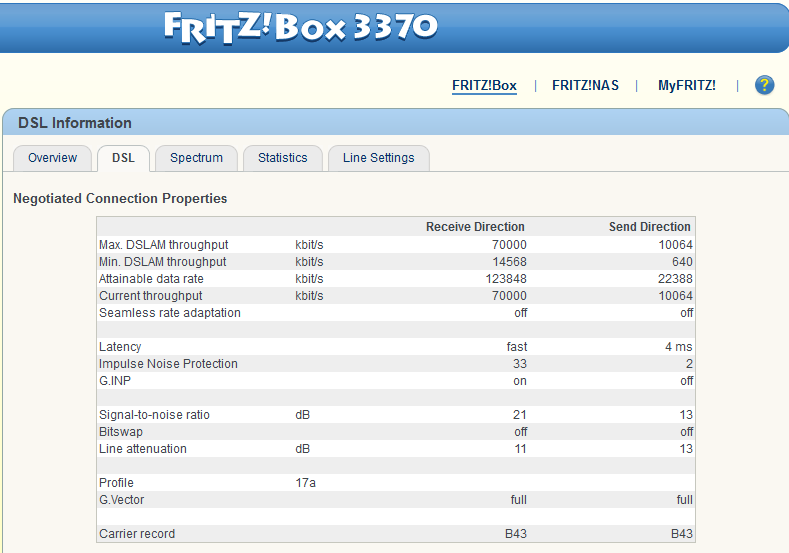 jelle87 schreef: Deze morgen deed mijn internet het even niet en ben ik ingelogd in mijn fritzbox om te kijken wat er aan de hand was. Na 2 keer reconnecten krijg ik terug een verbinding maar heb ik plots 60mbit/10mbit. Ik ben is even naar de waarden gaan kijken maar wat me vooral opviel is dat er bij g.vector nu opeens de waarde "full" staat.