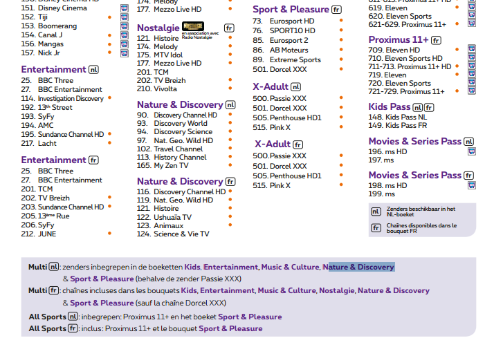 Eerst spreken ze van meer dan 40 zenders: Als je dan doorklikt zijn het er plots 35 (meer dan 30 en als je telt 35): Vervolgens deze lijst lijkt het mij dan weer wel (met uitzondering van Passion XXX): Duidelijkheid troef dus