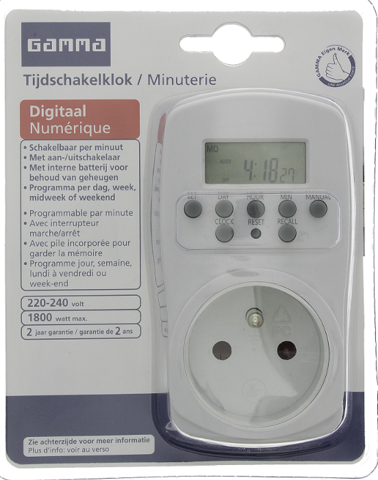 Ik ben op zoek naar een digitale tijdschakelaar. Ik heb er eentje maar die ingebouwde klok loopt enorm voor. Een week of 3 geleden heb ik ze nog eens juist gezet en ondertussen loopt ze weer ruim 5 minuten voor. Ik denk dat ze makkelijk 1 minuut per week voorloopt. Ik denk dat ik er eentje heb zoals de foto in bijlage.