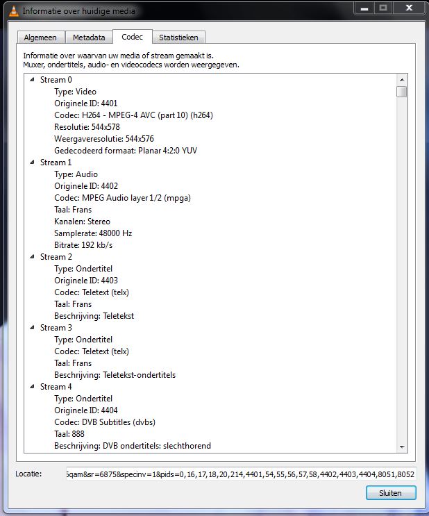 Maar als ik bijvoorbeeld de stream van FR3 (niet versleuteld) via VLC Media Player bekijk, zie ik toch dat er naast 2 Teletekst streams (codec = telx), er ook een "DVB Subtitle" stream (codec = dvbs) meegestuurd wordt.