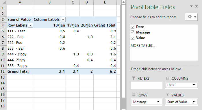 Het is dus een vorm van groeperen op "message" en de values dan samentellen.