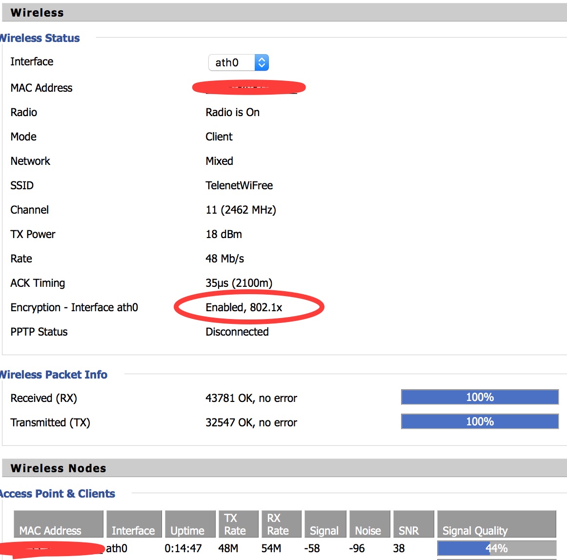 Normaal verbindt de router zich nu automatisch met de hotspot. Je kan met je toestellen inloggen op de router, zowel via kabel (ethernet) als draadloos. De DNS die je krijgt zal van de hotspot komen. Het eerste toestel dat zich verbindt, zal de autorisatieprocedure moeten doorlopen. Eenmaal dat achter de rug is, kunnen alle toestellen vrij het internet op. De hotspot kan immers niet zien dat er zich meerdere toestellen achter de router bevinden, hij ziet enkel de router, en diens MAC-adres is geautoriseerd.