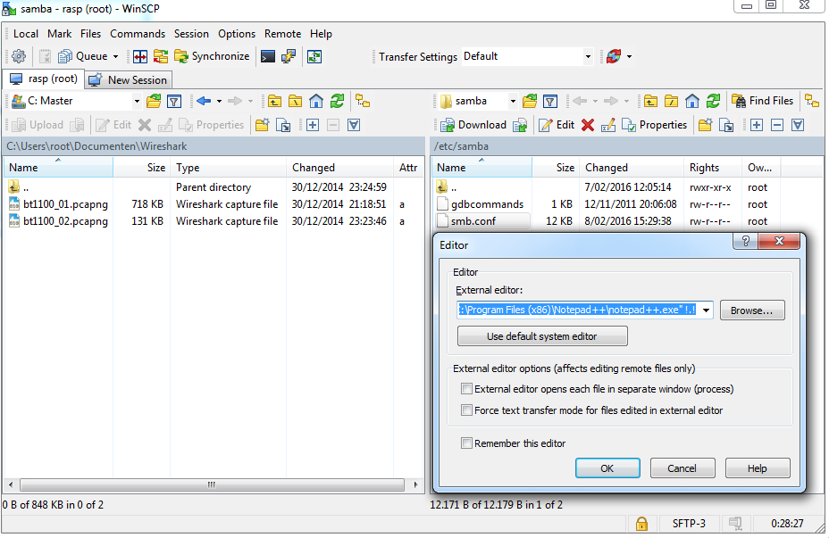 Screenshot van WinSCP en Notepad++ als editor (klik om te vergroten).