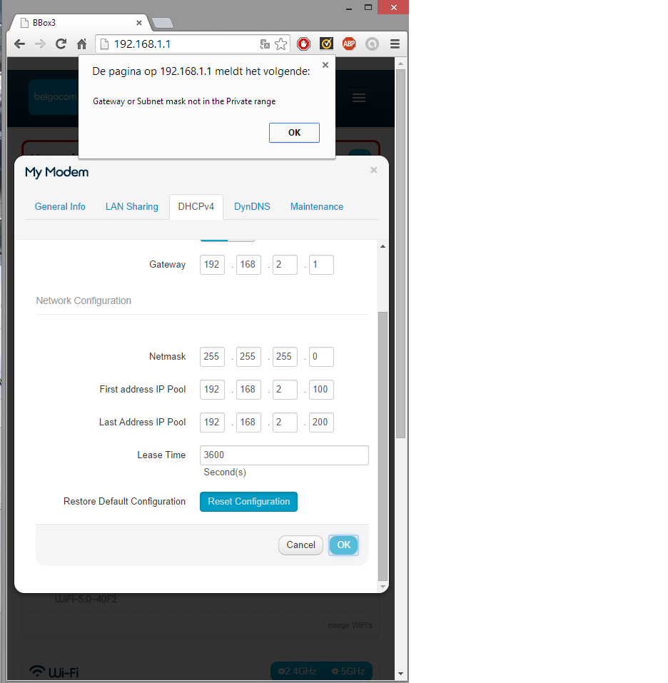 Hier kan je je IP adres instellen alsook het IP adres bereik van je netwerk die je via de Bbox3 wil aansluiten.