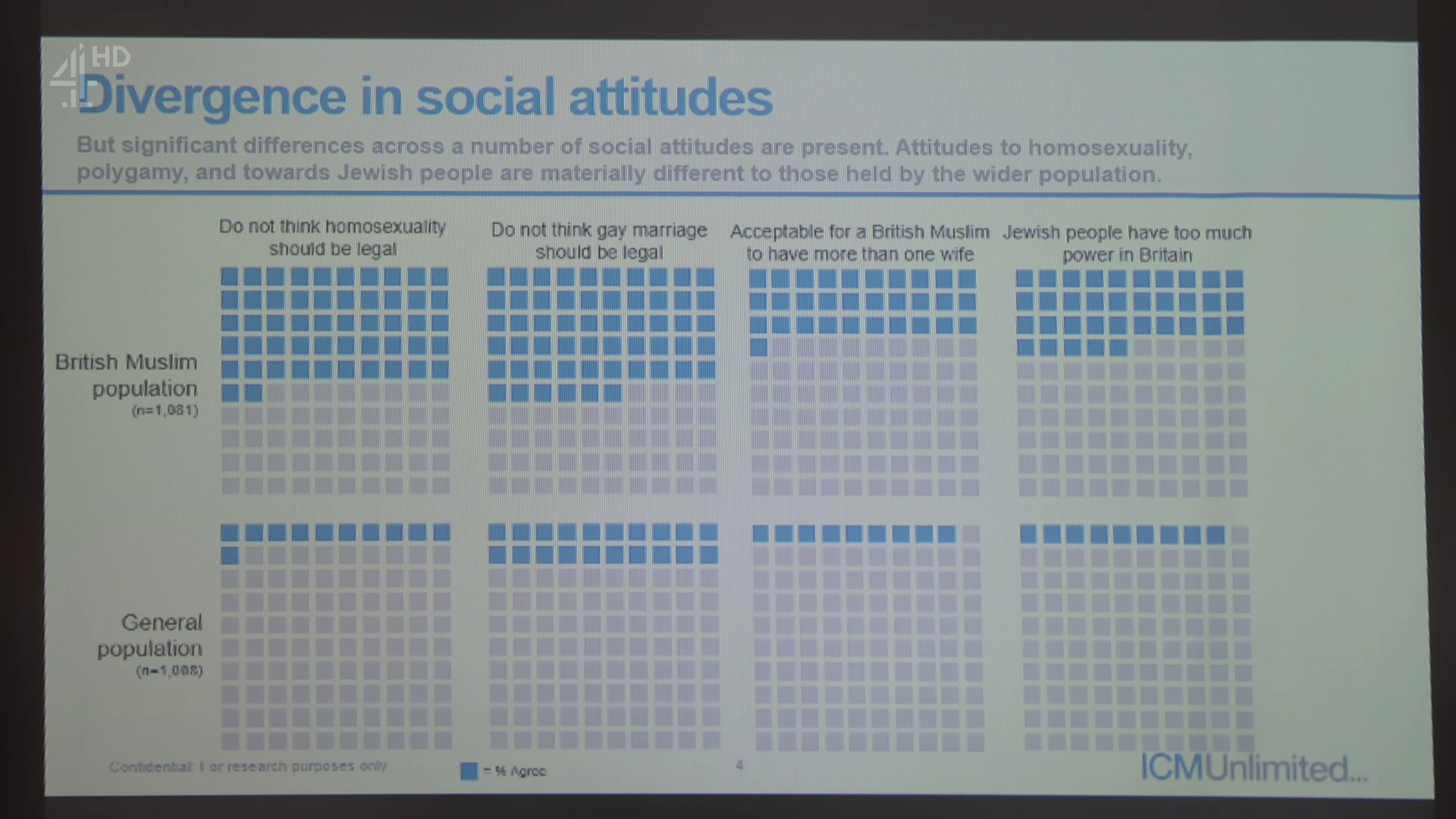 Er blijkt ook uit dat de meeste moslims enkel niet-moslims ontmoeten op het werk of in de winkel, zeer oppervlakkige contacten dus.