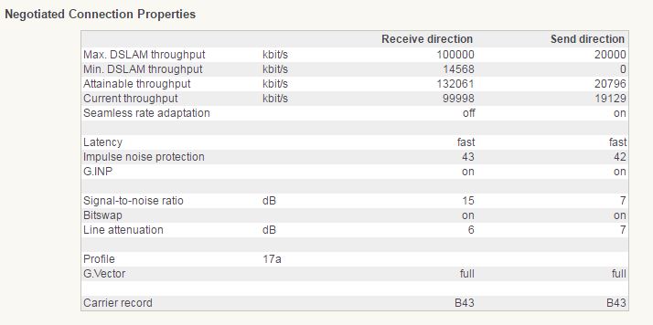 Jou line attenuation waarden zijn exact dezelfde als die van mij. Alleen is bij mij de SNR voor de send direction kantje boordje waardoor de upload throughput wegzakt van 19999 naar 19129