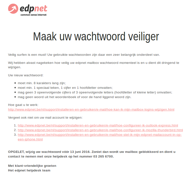Als het paswoord niet wordt gewijzigd voor 13 juni, blokkeert edpnet je mailbox
