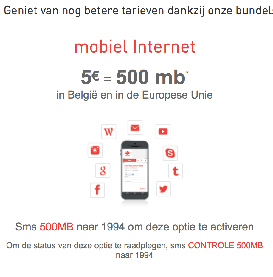 * Om deze optie te kunnen aanschaffen, dien je ten minste 5 € krediet op je kaart te hebben. De inbegrepen MB's blijven gedurende 31 dagen geldig en kunnen enkel in België en in de Europese Unie worden verbruikt. Zodra de in de optie begrepen MB’s zijn opgebruikt, zijn de normale tarieven van toepassing.