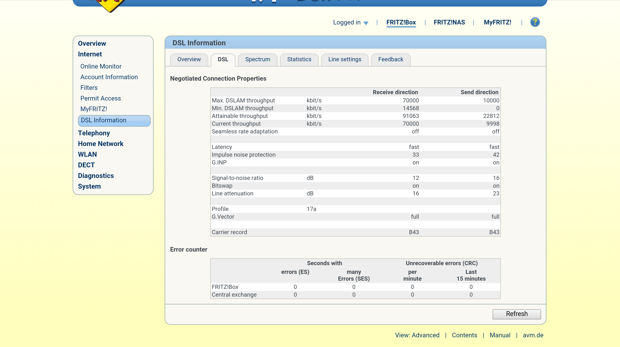 10.07.16	17:28:08	DSL is available (DSL synchronization exists with 70000/9998 kbit/s).