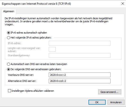 Zie screenshot dan ga je bij eigenschappen van iPV6 en vul deze DNS adressen in als 1ste en 2de DNS