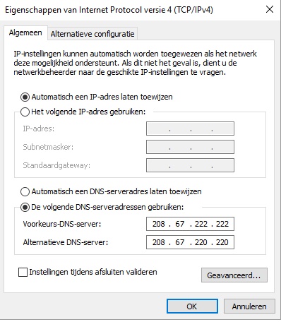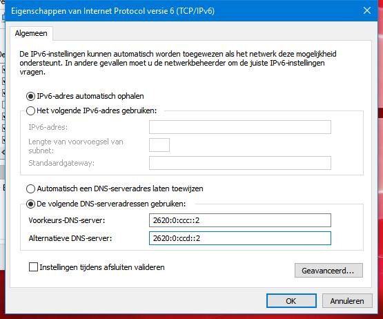 Zie screenshot dan ga je bij eigenschappen van iPV6 en vul deze DNS adressen in als 1ste en 2de DNS