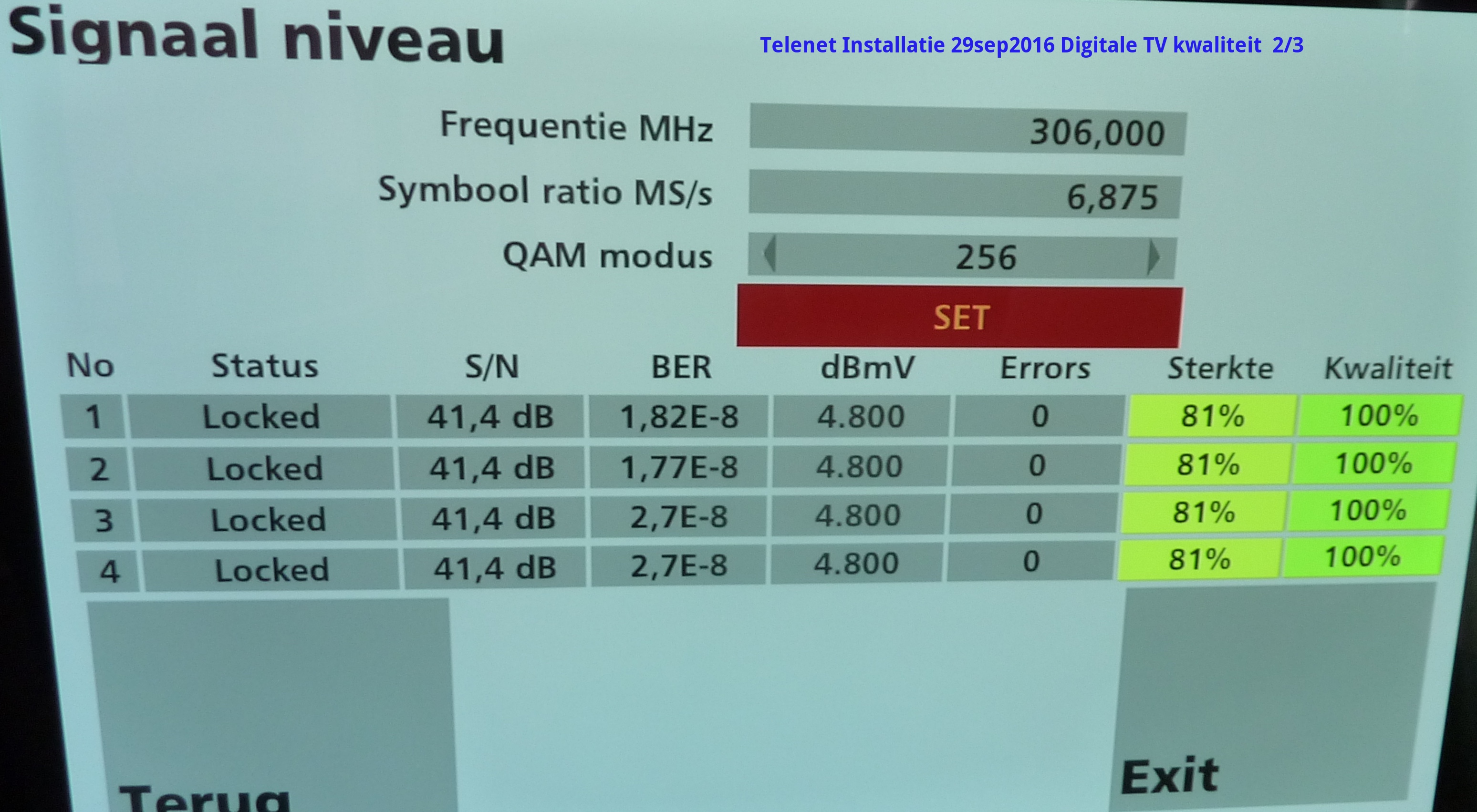 306 Mhz S/N 41,4 dBmV 4.800 ERR 0 Sterkte 81% Kwaliteit 100%