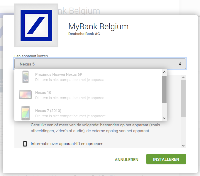 Deutsche Bank heeft enkele weken geleden eindelijk hun app gelanceerd: MyBank. Alleen, ik krijg hem niet geinstalleerd op mijn Nexus 6P. Sterker nog: op geen enkel device waar ik Android 7 heb op staan (wél op 'n oude Nexus 5 met Android 6.x...). Ik dacht: oh, dat zijn de bij Deutsche Bank vergeten goed in te stellen bij het publiceren naar de Play Store, maar toen ik hen daarover contacteerde, beweerden ze dat ze dit nadien geprobeerd hebben, ook met een Nexus 6P en de identieke versie en dat het bij hen wél werkte. Het probleem zou bij mij liggen...