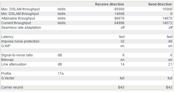 If Proximus would not impose the fixed profiles, your line would sync at 96/14, with a SNR of 6dB, both for upload or download.
