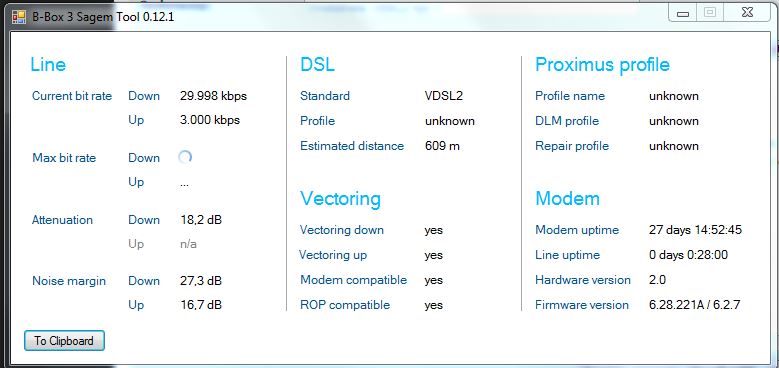 Wat de vdsl tool toont is dat je in zone 3 zit, met een vectoring-profiel van 30/3. Je lijnwaarden zien er trouwens niet slecht uit, je zou al zeker 40/5 of 50/5 moeten kunnen halen met DLM. Je lijn lijkt me eerder verkeerd geconfigureerd te zijn bij Proximus, je zou in zone 2 moeten zitten volgens de info die je op de site ziet. In zone 2 haal je minimaal 50/6, en maximaal 100/20.