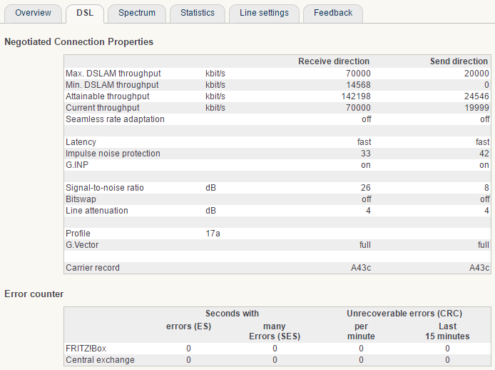 De FRITZ!Box had ik voordien al min of meer klaargezet, dus de beste man hielp ook snel om de router online te krijgen (hij had mijn login en paswoord al). Daar ook even snel mijn lijnwaarden mee bekeken. Hij gaf ook aan dat er een TBF zou zijn (toen ik er naar vroeg), maar dat dat om Edpnet om ging als ik het mij goed herinner. DLM zou later hoogstwaarschijnlijk ook vectoring activeren en mijn snelheden stelselmatig verhogen.