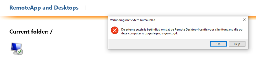 Nadat ik de pc opstartte werkte het weer zoals het hoorde. Nu sloot ik de rds terug af, en wil hem opnieuw opstarten en krijg ik opnieuw dezelfde fout, dit op beide laptops hier thuis. Wat zou er fout kunnen zijn? Telkens ik de sleutel verwijder en restart werkt het slechts één keer.