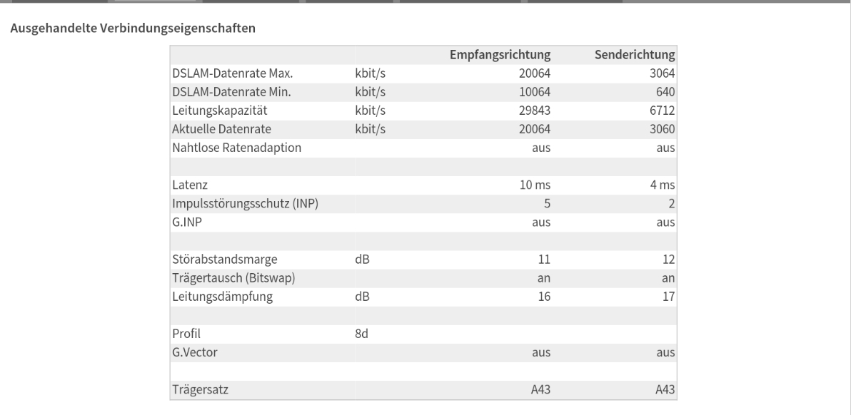 Receive direction Send direction Max. DSLAM throughput kbit/s 70000 15000 Min. DSLAM throughput kbit/s 14568 0 Attainable throughput kbit/s 103534 26965 Current throughput kbit/s 70000 14998 Seamless rate adaptation off off Latency fast fast Impulse noise protection 33 42 G.INP on on Signal-to-noise ratio dB 15 13 Bitswap on on Line attenuation dB 18 21 Profile 17a G.Vector full full Carrier record J43 J43