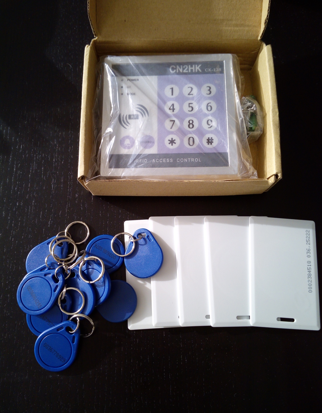 een CK-138 rfid/keypad combinatie lezer, met 5 kaarten en 10 keyfobs erbij.