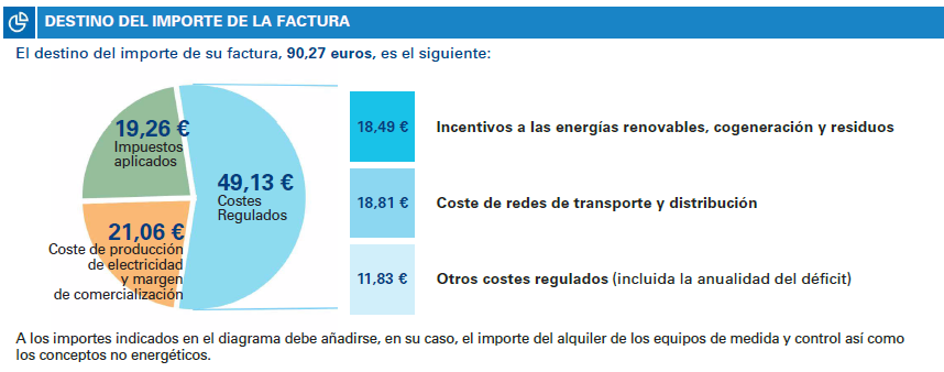 - 30€ distributie (waarvan 11.5€ subsidies groene energie + 11.5€ transport en distributie + 7€ bijdrage aan het jaarlijks deficit (de Spaanse turkeltaks?).