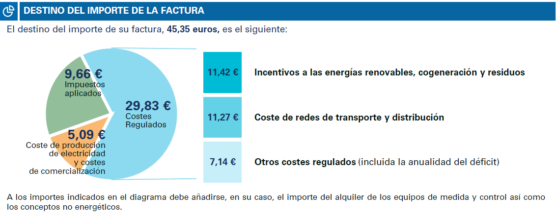 • 30€ distributie (waarvan 11.5€ subsidies groene energie + 11.5€ transport en distributie + 7€ bijdrage aan het jaarlijks deficit (de Spaanse turkeltaks?).