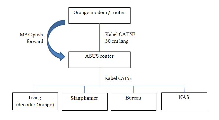 Na de installatie door de Orange technieker, die zelf ook de technische dienst moest bellen om iets "open" (?) te zetten, ben ik gestart met de opbouw van het eigen netwerk. Ik heb zelf een ASUS RT-AC87U router en alle apparaten zitten achter deze router. Ik heb een MAC pushforward uitgevoerd van de Orange modem/router naar de ASUS router. De topografie van mijn netwerk is zichtbaar in onderstaande figuur.