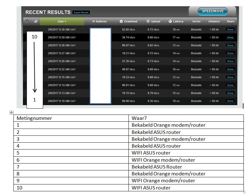 Ik heb al verschillende snelheidstesten uitgevoerd om de kwaliteit van Orange te testen. Ondertussen heb ik al gemerkt dat de snelheid enorm varieert. Dit kan rechtstreeks op de Orange modem/ router bekabeld gemeten gaan van 12 MBps tot 100 Mbps. Dit is een probleem waarvoor ik de technische dienst ga contacteren. Maar deze info is misschien relevant voor mijn eigenlijke vraag.