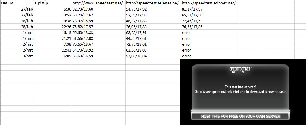 Ik heb dus op aanvraag van hun op meerdere tijdstippen van de dag speedtests gedaan. Enkel op 8/02 rond 6:24 haal ik de correcte snelheid welke ik bij Scarlet op eender welk moment van de dag had.