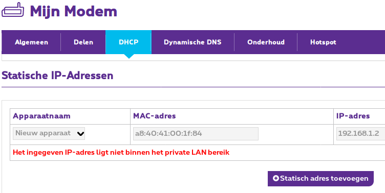 Reeds bij het ingeven van 1 statisch adres die buiten de dhcp pool valt heb ik dus een foutmelding: