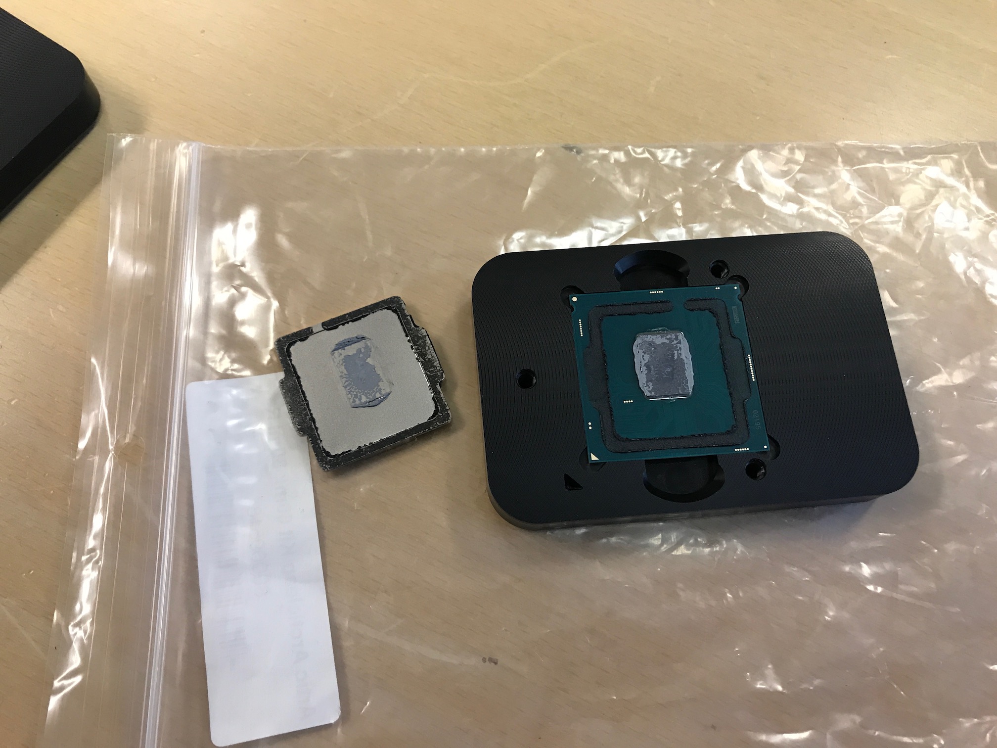 Ik heb een 7700K CPU in m'n kleine DAN A4-SFX case zitten. Door de grootte (of kleinte?) van deze case kan je maar CPU coolers tot 47cm 'hoogte" gebruiken. Eén van de betere coolers is de Noctua NH-L9i, mede door de fan die stil is en toch 2500RPM haalt. Alleen raadt Noctua zelf aan dat er voor een 91W TDP (mijn 7700K dus) een case met goede airflow moet gebruikt worden. Eigelijk is de cooler maar geschikt tot 65W TDP CPUs. Omdat alles in deze case nogal op elkaar geprakt zit, verhitten alle onderdelen elkaar, de warme lucht kan we goed naar buiten (vent holes overal) maar alles wordt wat warmer dan in een grote case met veel meer afstand tussen de verschillende onderdelen. In synthetische benchmarks liep de temperatuur van de CPU op tot zo'n 95°, en als je weet dat deze een thermal limit van 100°C heeft vooraleer hij begint te throttelen is dat eigelijk goed warm. Na wat opzoekingswerk ben ik erachter gekomen dat de dikke vaste zwarte heat-resistant lijm die Intel gebruikt om de IHS op de PCB van de CPU vast te lijmen redelijk dik is, hierdoor moeten ze ook veel koelpasta gebruiken zodat er contact gemaakt wordt tussen de die van de CPU zelf en de IHS van de CPU package. Dus heb ik die met een speciaal hiervoor ontworpen tool erafgehaald en ga nu de koelpasta vervangen door een Liquid Metal laag, en gaat die dus de temperatuur veel beter kunnen transporteren naar de CPU cooler