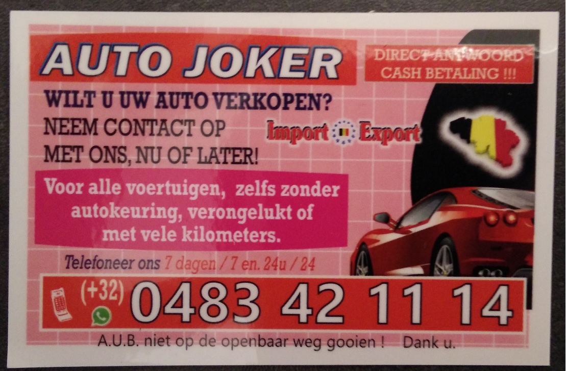 Intussen een kaartje met nummer in handen gekregen: "Car Export"; 0470 51 22 20