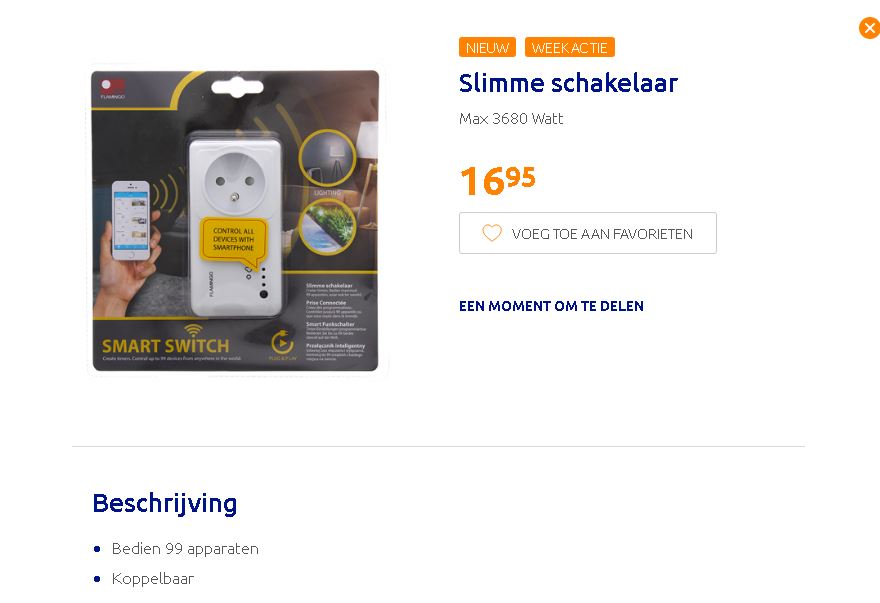 Zoek daar op "slimme schakelaar". Tot 99 toestellen bedienen (via de smartphone). Max. vermogen 3680W